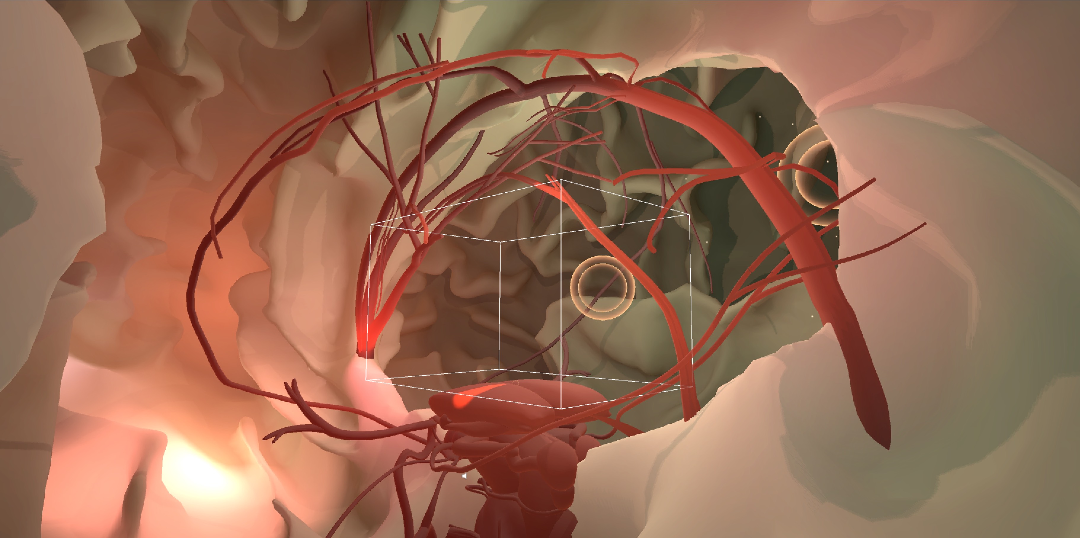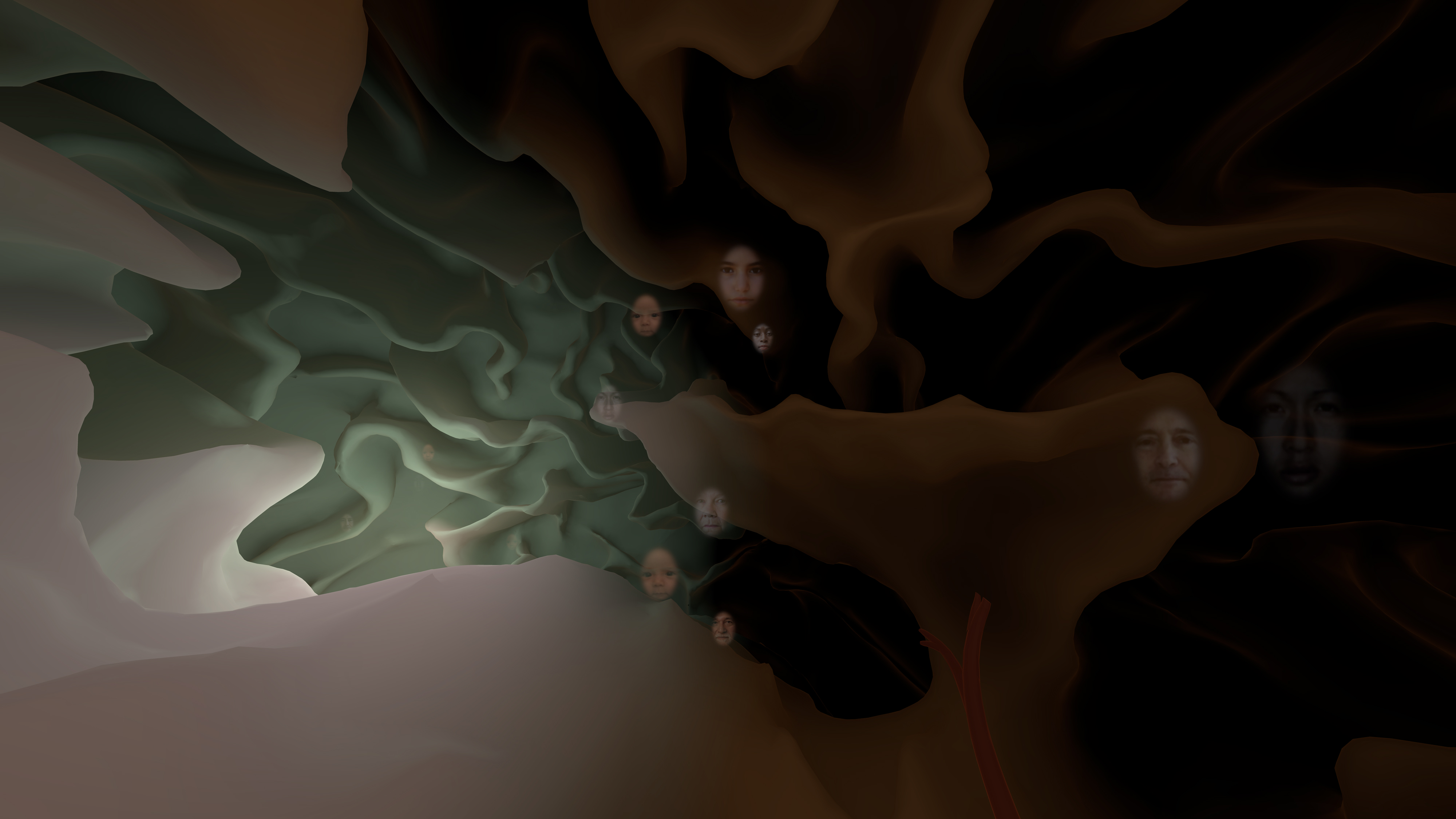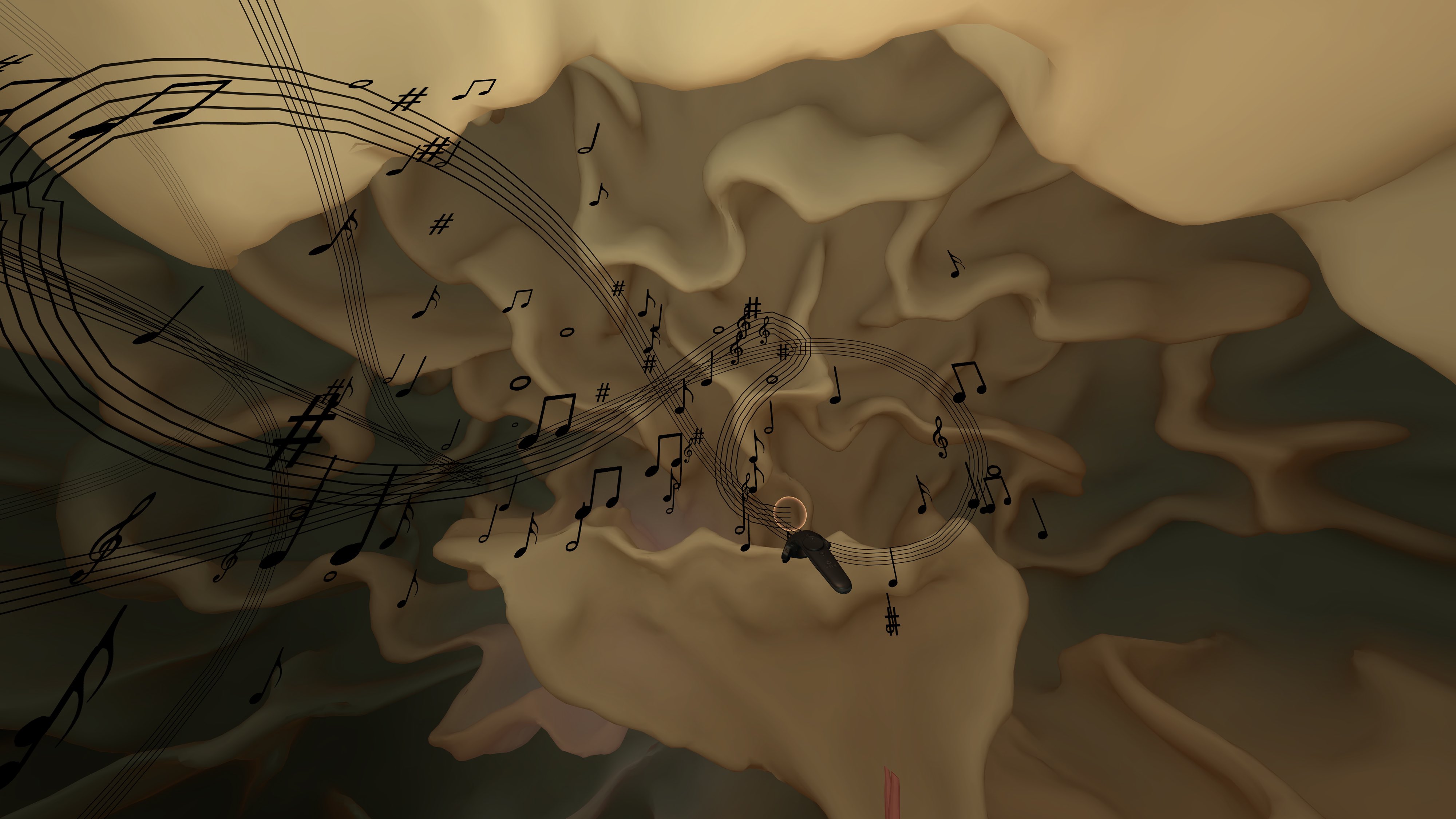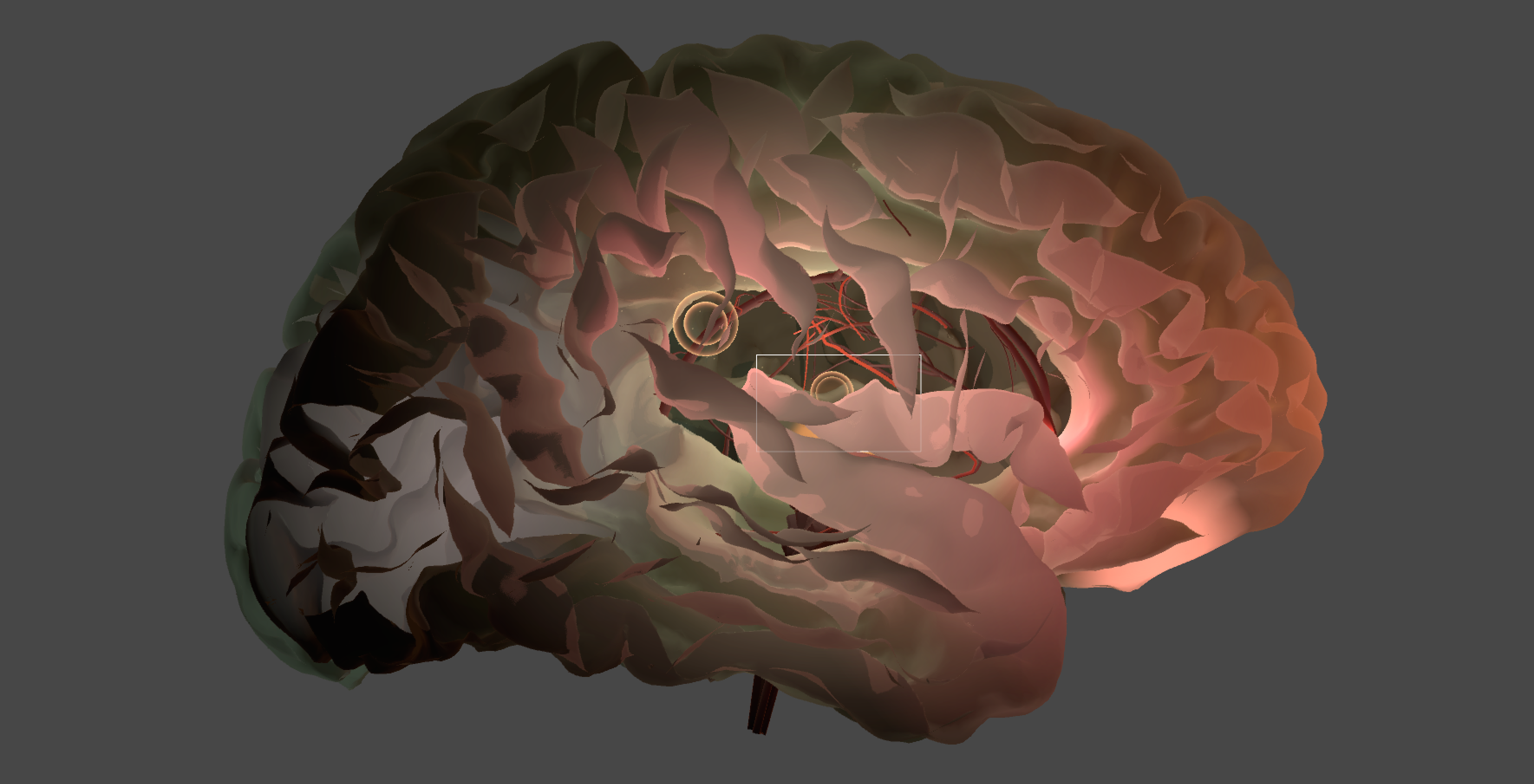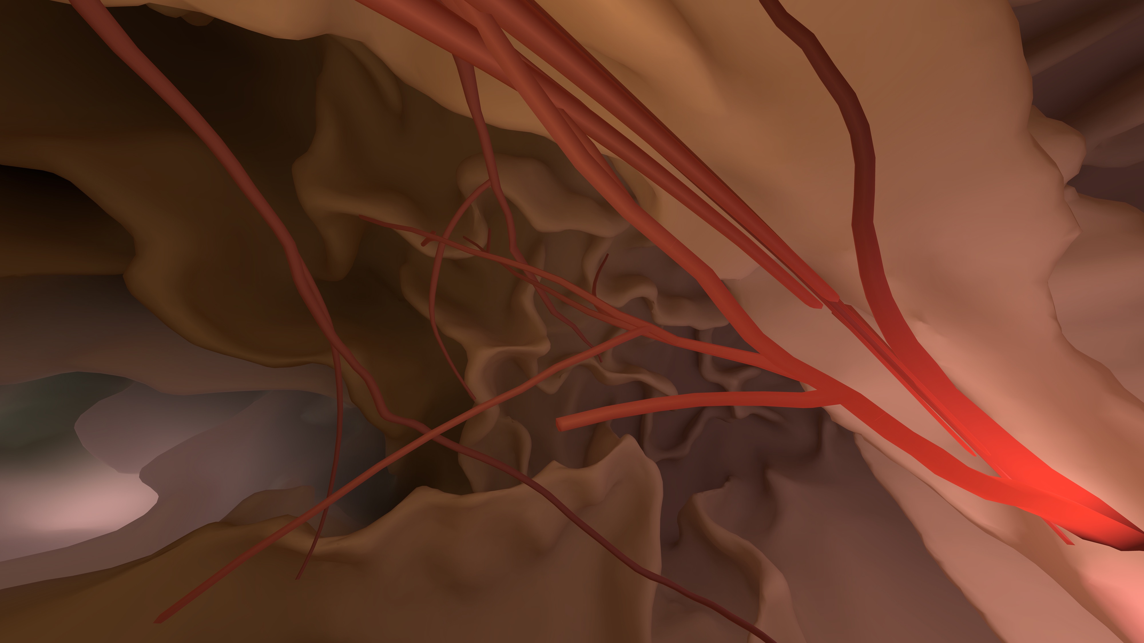 INSIDE consists of three worlds: the Night Desert, the Brain Cave and Nature. We begin in the desert where a mysterious presence appears and enters our personal space then transports us to a place inside the brain. As we explore this primordial cave of the brain, originating from MRI data of brain scans, we discover deeply ingrained images and sounds. Our journey continues with a ride through the optic nerve to arrive at what appears to be a soothing natural landscape.