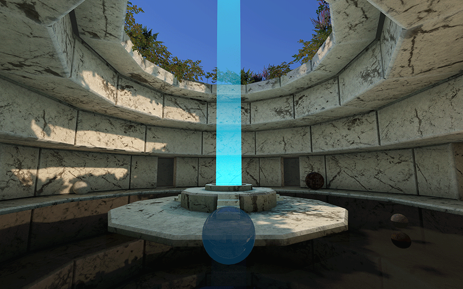 While the viewer is interacting with their virtual reflection, their shadow is projected on a special screen in the exhibition space, revealing their actions to the audience. This presents two components to the art experience; the intimate, self-reflective experience in the virtual world and the projected, public experience via the shadow screen.