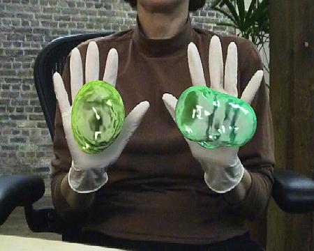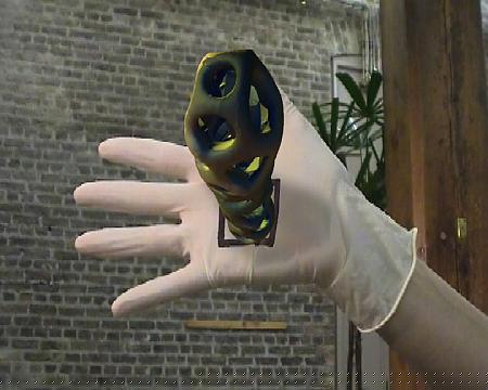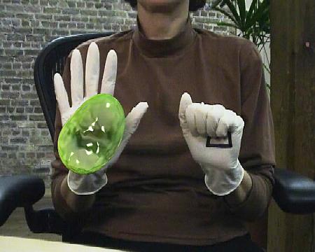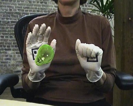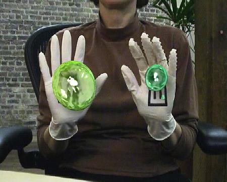 Various displays and cameras are embedded in the physical environment to act as "magic mirrors". As participants reveal the graphic markers on their gloves or other clothing, they see surprising images and animation combined with their reflection. In game applications, the computer generated images can provide clues to the game. Markers can even be hidden in t-shirt logos, displaying unusual special effects on the visitors' clothes.