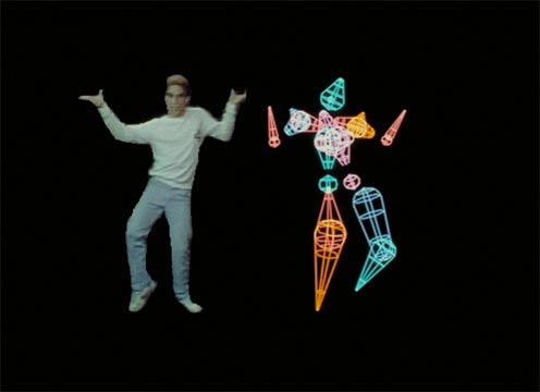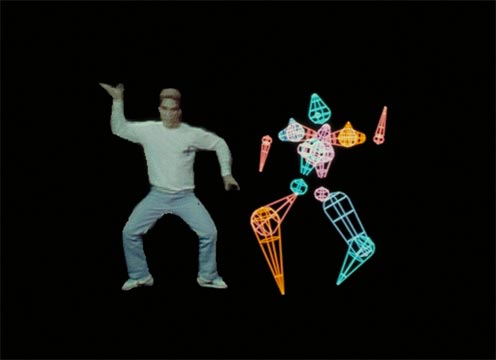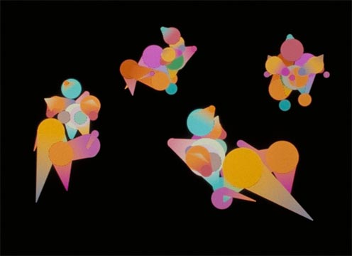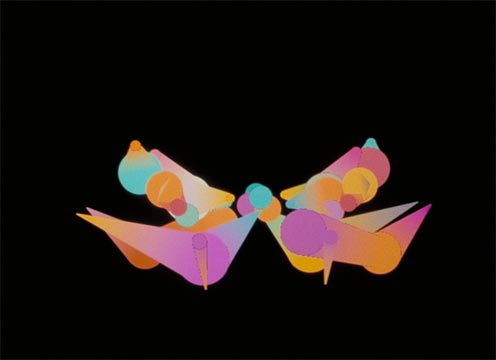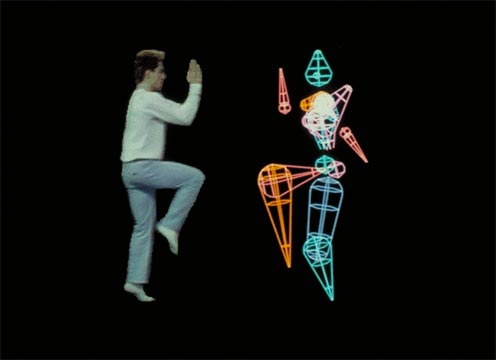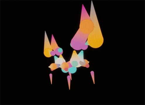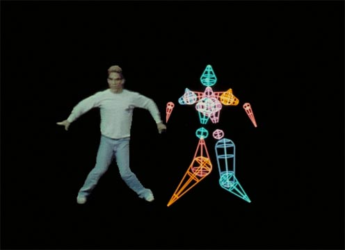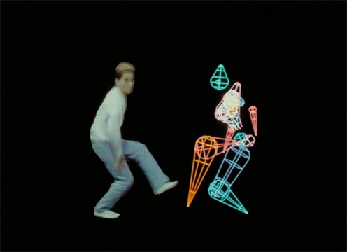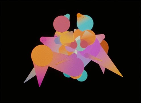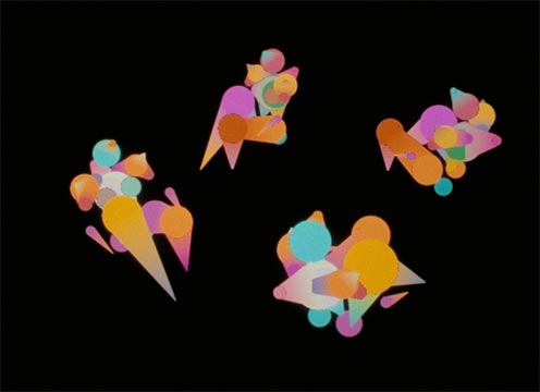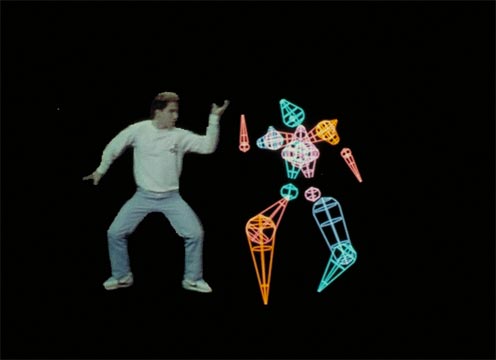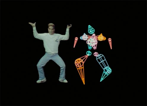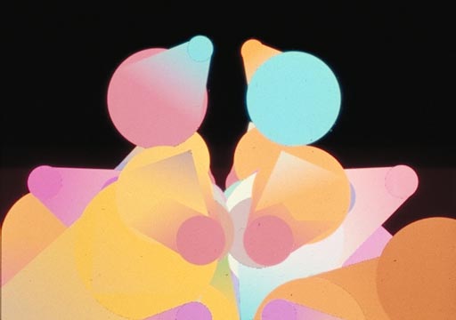 In this award-winning video Allen continued her exploration of novel dance movement by working with breakdancers from the newly emerging breakdance scene in NYC. Allen combines live breakdancers, whose images are manipulated using one of the earliest digital synthesizers, with Bauhaus Theater inspired, computer generated breakdancing partners made of colorful geometric forms, dancing in elegant style.